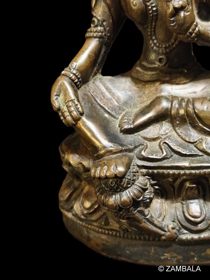 The typical depiction of Green Tara is that of a young and beautiful woman with emerald green skin, wearing a jeweled crown (topped with Amitabha Buddha), her right hand resting on her knee in the varada mudra (gesture of granting wishes), symbolizing the bestowal of blessings; her left hand holds a blue lotus (utpala), symbolizing purity and wisdom. She sits with one leg crossed and the other extended, indicating a posture of readiness for action.