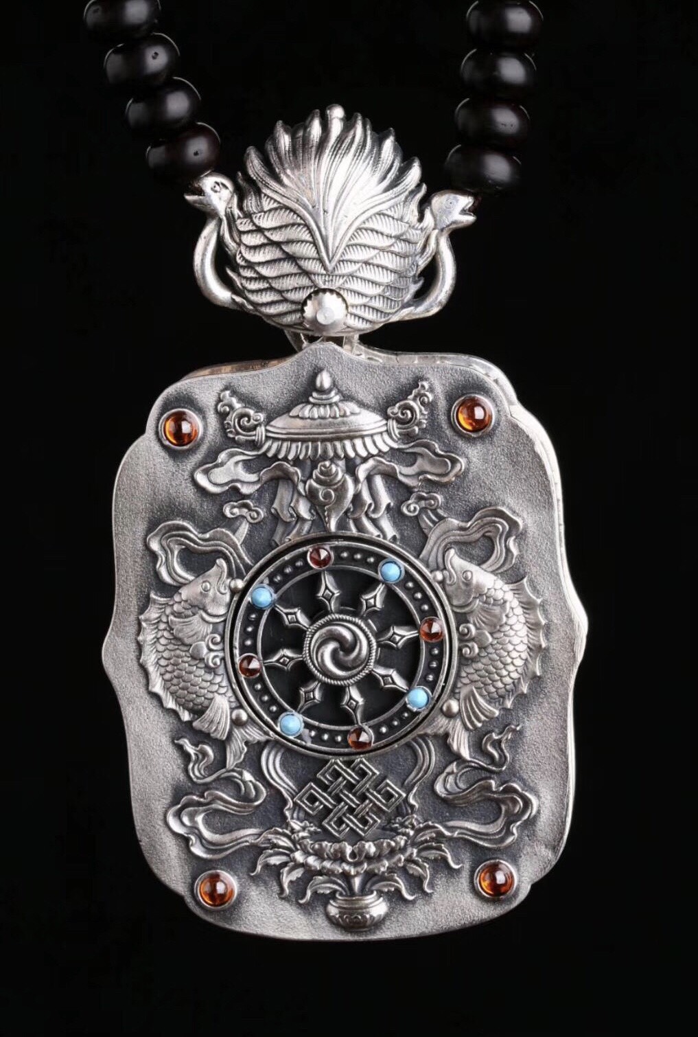 Coconut shell of beads, 92.5 % sterling silver ,Turquoise and electric plating gold statue.
