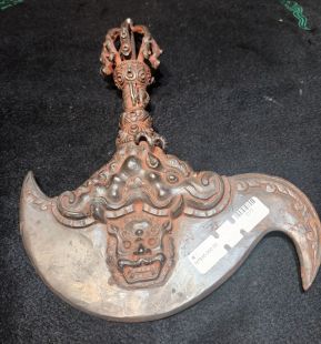 The handle is a vajra with a steel curved knife embedded underneath. Its meaning is to destroy all restraints.