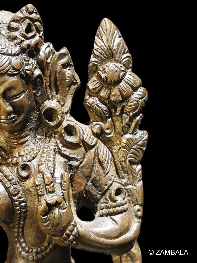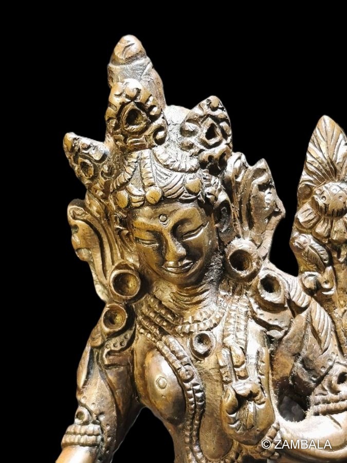 The typical depiction of Green Tara is that of a young and beautiful woman with emerald green skin, wearing a jeweled crown (topped with Amitabha Buddha), her right hand resting on her knee in the varada mudra (gesture of granting wishes), symbolizing the bestowal of blessings; her left hand holds a blue lotus (utpala), symbolizing purity and wisdom. She sits with one leg crossed and the other extended, indicating a posture of readiness for action.